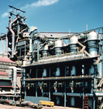 鉄鉱石から銑鉄を作り出すのが高炉(溶鉱炉)です。製鉄所のシンボルである高炉は大型化が著しく進展し、日本では高さ100m以上、内容積4,000m³以上の世界最大級の設備が主流です。ここから一日におよそ1万トンもの銑鉄が生み出され、その操業を数々のセンサーとコンピュータがコントロールしています。