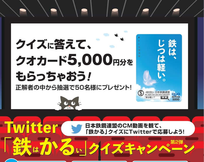 さらに、シネマ広告期間中に合わせてTwitterにて「鉄はかるい」クイズキャンペーン第二弾を実施いたします。当該キャンペーンは、動画をご覧いただいた後、Twitter 上で「#鉄は軽い」のハッシュタグを付けて動画の内容に沿った以下のクイズの答えをリツイートし、正解者の中から抽選で50名様にクオカード5,000円分をプレゼントするものです。どうぞ奮ってキャンペーンにご参加ください。